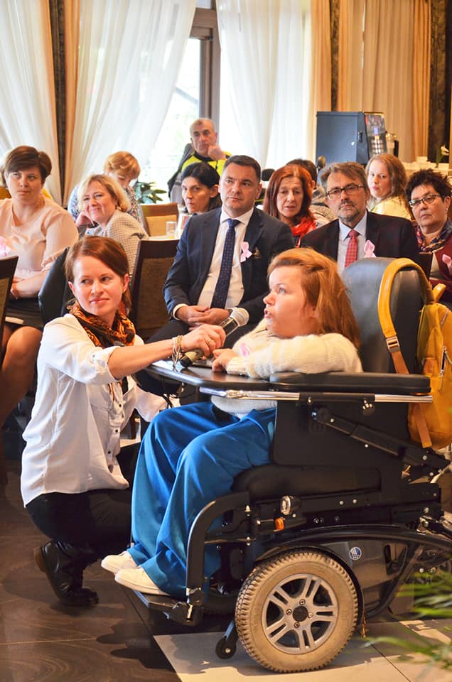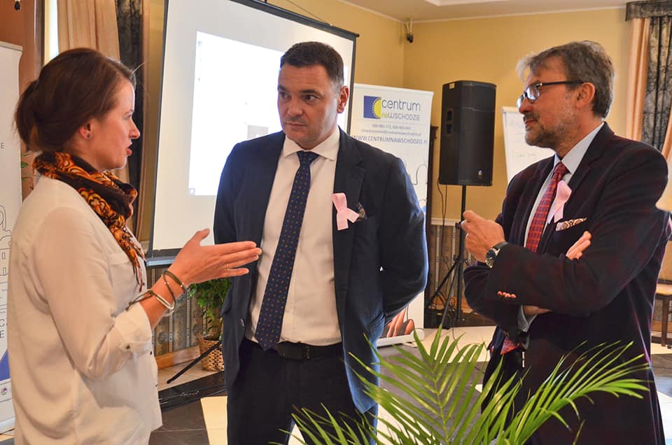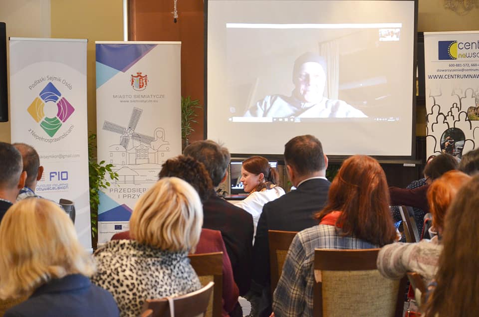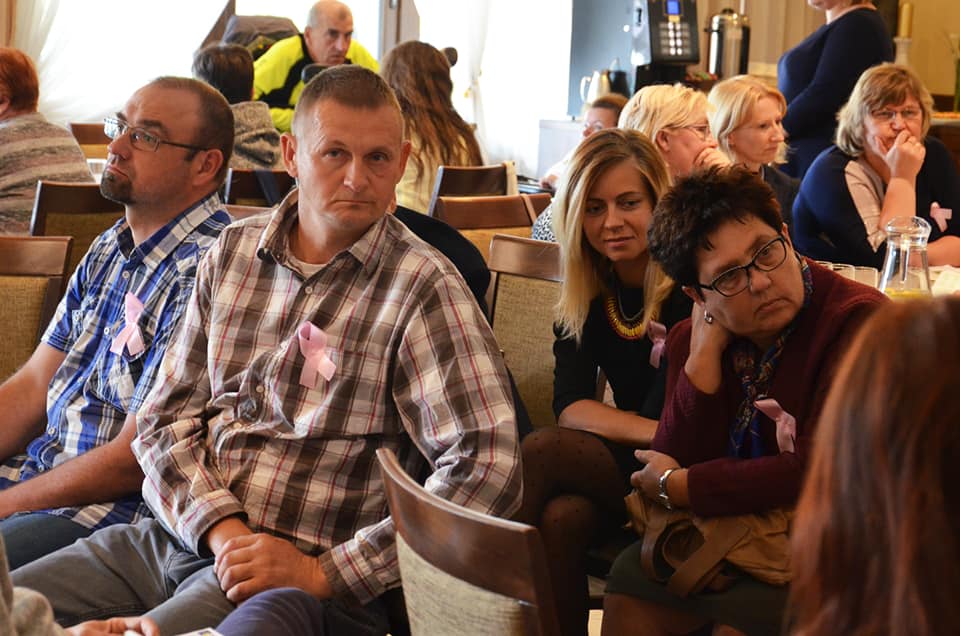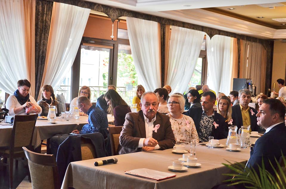 Na zaproszenie Stowarzyszenia „Centrum na Wschodzie” w Konwencie wzięła udział p. Janina Ochojska – posłanka do Parlamentu Europejskiego, założycielka i prezeska Polskiej Akcji Humanitarnej (PAH). Ze względu na aktualny stan zdrowia, możliwe było jedynie spotkanie przez Skype (Pani Ochojska jest w trakcie leczenia onkologicznego, po niedawnym zdiagnozowaniu nowotworu piersi). Techniki cyfrowe pozwoliły jednak przeprowadzić doskonałe spotkanie, także z możliwością zadawania pytań z sali, a na zakończenie wykonano nawet wspólne zdjęcie. Spotkanie z p. Janiną Ochojską było dla wszystkich niezwykłym przeżyciem. To przecież osoba z niepełnosprawnością, która tak wiele dobrego robi w ramach pomocy humanitarnej, a teraz także reprezentuje nasz kraj na forum UE. Pani Poseł podkreśliła, że tematyka niepełnosprawności jest na czele listy tematów, którymi zajmuje się w Parlamencie Europejskim. Uwagi i postulaty płynące z siemiatyckiego spotkania trafiły zatem wprost do najbardziej odpowiedniej osoby. Uczestnicy Konwentu, w dowód solidarności z p. Janiną Ochojską oraz wszystkimi chorującymi na raka piersi, przypięli różowe wstążki.